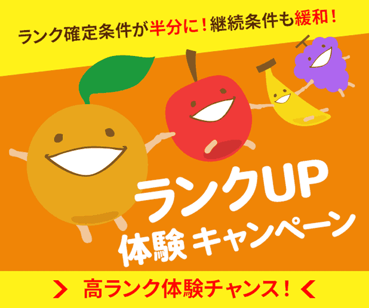 9月のランク確定&継続条件を大幅に緩和する「ランクUP体験キャンペーン」実施中!5月16日~8月15日の集計期間中は、9月のランク確定に必要なポイント数がなんと通常の“半分”に!さらに、ランクをキープするための継続条件も、通常の62.5%~75%に緩和されます。いつもより手軽に高ランクを目指せるチャンス!たくさんポイントを貯めて、もっとおトクにフルーツメールを楽しもう!