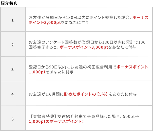 フルーツメールをお友達に紹介いただくと、あなたにも、お友達にも、嬉しい紹介特典をプレゼント。お友達を紹介した分だけ紹介ボーナスが獲得でき、さらに、お友達が1か月間に貯めたポイントの5%分が付与されるなど、特典が盛りだくさんのお友達紹介制度を上手に活用しましょう。