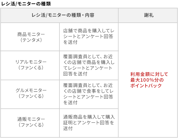 いつもご利用されているお店やサービスでモニターを体験後、カンタンなアンケートに答えたりレシートを送付するだけで 最大100%ポイントバック、実質無料になるチャンス!いつもの外食やお買い物が圧倒的におトクにご利用できるサービスです。