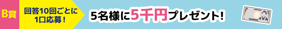 期間中にアンケート10回答で1口の応募ができ、抽選で5名様に現金5000円が当たる!