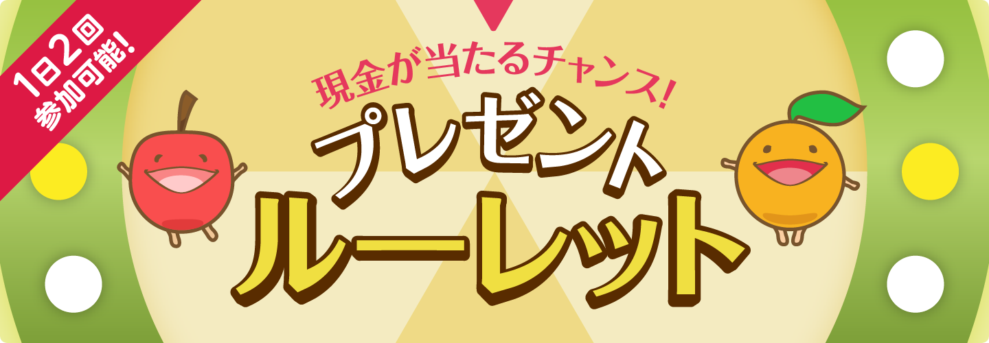 ルーレットを回してアタリを目指そう!アタリが出ると、現金が当たる懸賞に応募するチャンス!1回のプレイでルーレットは何度でも回せます。当たるまで回してみよう!さらに、1日2回(午前、午後それぞれ1回ずつ)プレイが可能。午前と午後の計2回応募して、当選確率アップ!!